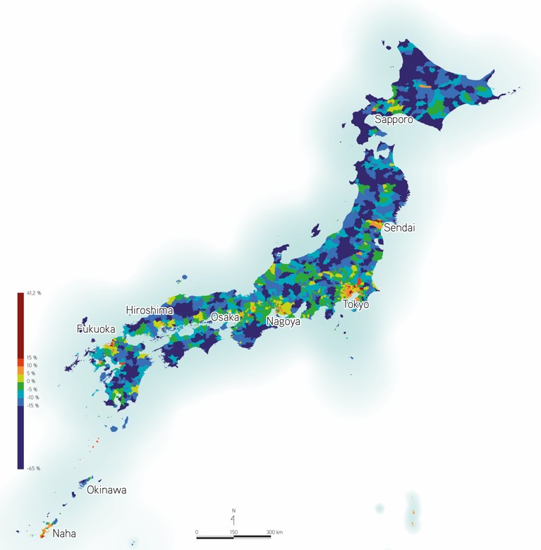 Les territoires ruraux et les villes moyennes n’arrivent plus à faire venir et à garder des jeunes ménages – avec ou sans enfants – dans des proportions suffisantes pour entraîner un renouvellement générationnel. Dans ces espaces, on observe une massification de la vacance résidentielle structurelle, qui touche notamment des logements individuels ou en petit collectif en propriété privée. Le taux de vacance à l’échelle nationale s’élève en 2023 à près de 14 % (contre 8,2 % en France à la même date selon l’Insee), soit près de 9 millions d’unités de logement non occupées, ce qui n’est pas incompatible avec une poursuite de la construction de logements neufs répondant aux normes sismiques et adaptés à la réduction de la taille moyenne des ménages. Au Japon, du fait des normes antisismiques, les maisons édifiées depuis les années 1950 ont une durée de vie moyenne de 40 ans. On lègue avant tout à ses héritiers un terrain à usage résidentiel que l’on peut détruire et reconstruire afin que ces derniers habitent dans des constructions actualisées ; ou bien les parcelles sont vendues à des tiers. Avec l’affaiblissement du renouvellement sociodémographique de nombreux quartiers urbains et périurbains, surtout dans les agglomérations moyennes, les biens non entretenus car non transmis se multiplient.