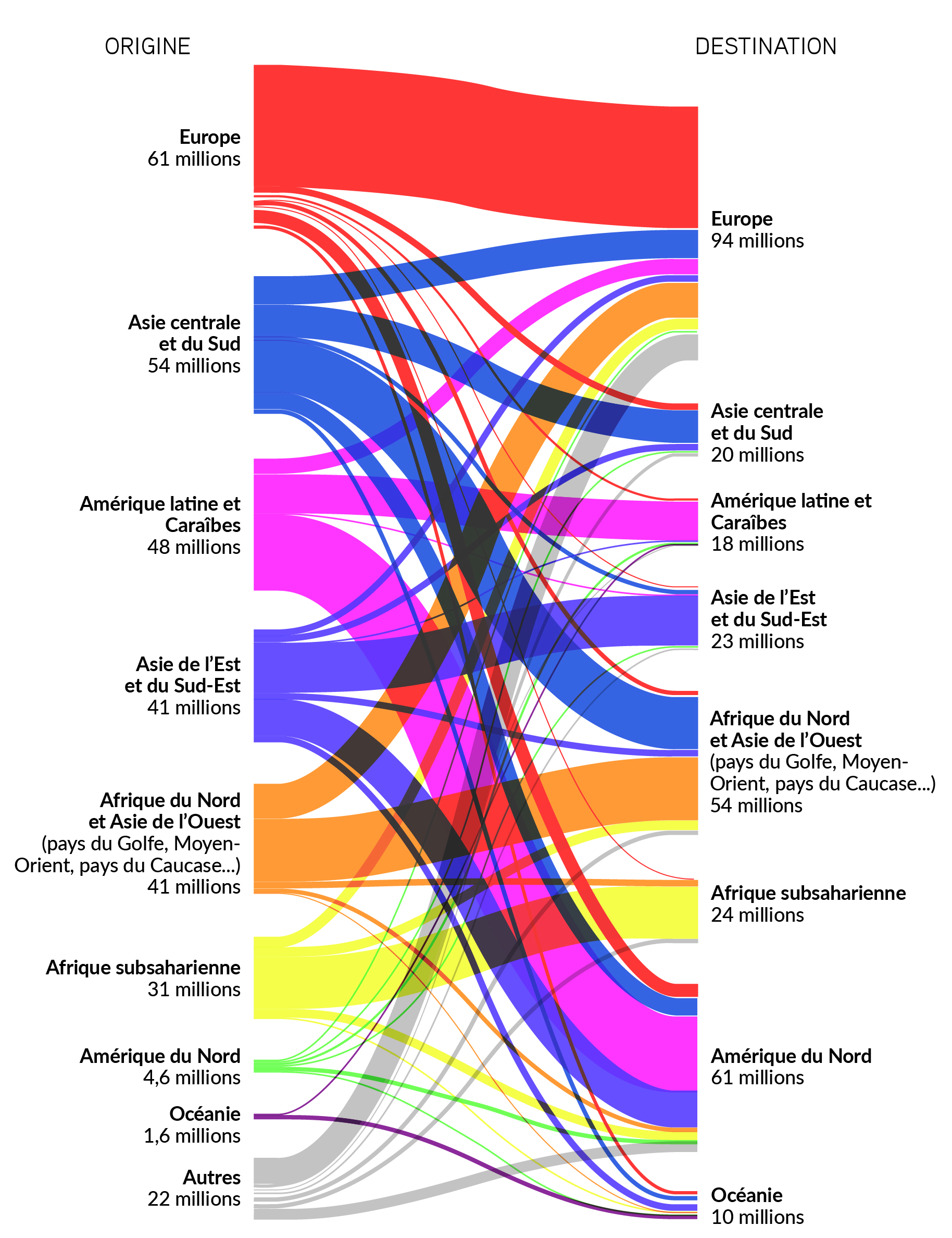 Les facteurs de la migration sont multiples. Elle peut être liée aux inégalités du développement humain mesuré par l’IDH (indice de développement humain), ou encore aux lignes de fractures du monde, qu’elles soient économiques, mais aussi politiques, sociales ou culturelles. Les migrations peuvent aussi être provoquées par des crises et conflits. Rappelons que 110 millions de réfugiés étaient dénombrés dans le monde en 2023, dont 26,5 millions seulement avaient le statut de réfugiés de la Convention de Genève de 1951. Les motivations peuvent aussi provenir de l’existence de réseaux transnationaux construits par les familles de migrants installées à l’étranger en diasporas, ainsi que des liens linguistiques et socio-économiques permettant de trouver du travail. Elles peuvent par ailleurs résulter de l’amélioration de la scolarisation et de la santé dans les pays de départ, des nouvelles technologies de l’information et de la communication qui donnent à voir, parfois à une distance assez courte, des modes de vie qui font rêver. Elles sont aussi organisées par des réseaux de passeurs offrant le passage hautement rétribué à ceux qui n’ont pas de visa pour entrer dans les pays qu’ils convoitent. Elles peuvent également être contraintes par la pression des familles de départ pour l’envoi de transferts de fonds (670 milliards de dollars envoyés en 2022 dans les pays d’origine, soit trois fois l’aide publique au développement). Les crises environnementales sont aussi un facteur de migration mais, là encore, contrairement aux idées reçues, les déplacés environnementaux, parmi les plus pauvres des migrants, ne vont pas loin et traversent rarement les frontières de leurs États. Ils sont en effet dépendants du milieu naturel pour continuer à vivre de l’agriculture, de la pêche ou de l’élevage. Ces crises environnementales peuvent dégénérer en conflits ethniques et politiques pour l’accès à la terre, comme ce fut le cas au Darfour.
